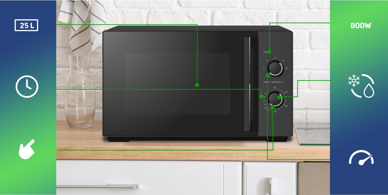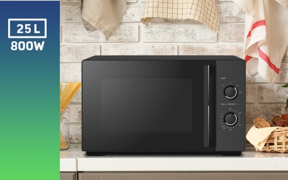 Indiferent ca vrei doar sa incalzesti mai repede mancarea si bauturile, sa dezgheti alimentele sau chiar sa gatesti mai rapid, un cuptor cu microunde este indispensabil in bucatarie. Cu o capacitate generoasa a cavitatii, de 25 L, si o putere de 800W, HMW-MD25MBK este optiunea ideala pentru a te bucura de alimente bine patrunse, preparate rapid si uniform sau de bauturi rapide si delicioase.