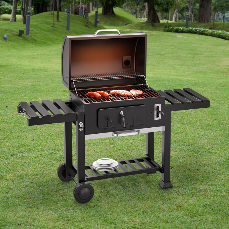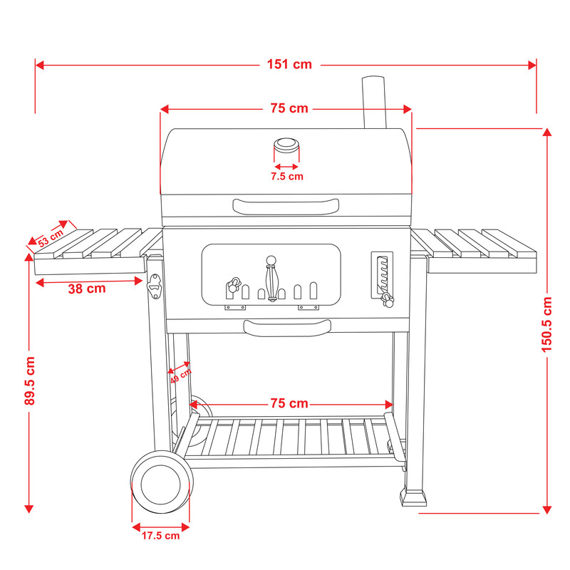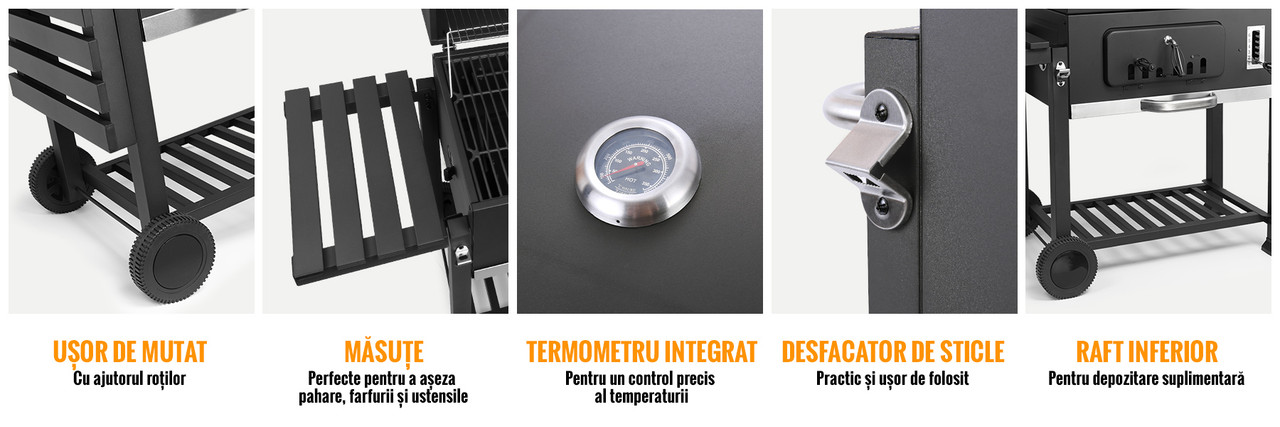 Caracteristici cheie Termometru Demontabil Capac Spatiu depozitare Picioare detasabile Afumatoare Suport ustensile si prosoape Etajera fixa Maner ajutator Ventilatie Recipient colectare grasime Tava pentru cenusa Suprafata de gatit reglabila
