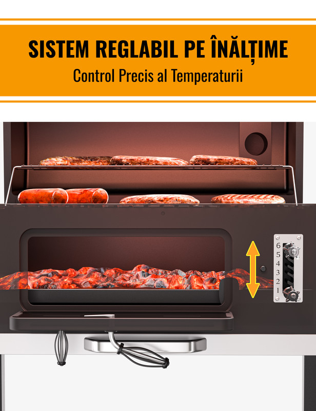 Cu ajutorul manetei usor de utilizat si a scalei numerotate, poti ajusta cu precizie inaltimea tavii pentru carbuni in 6 trepte. Astfel, controlezi mai eficient intensitatea caldurii, fie ca vrei o gatire lenta sau o friptura rumenita rapid.