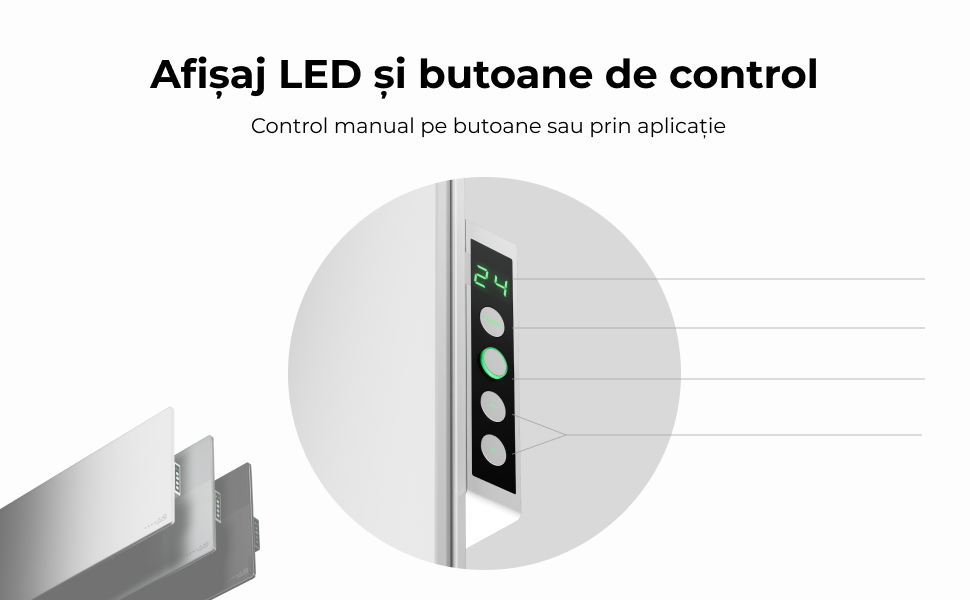 Noul ecran LED inovator, va permite sa monitorizati temperatura camerei si sa o ajustati cu usurinta folosind butoanele disponibile direct pe unitatea de incalzire