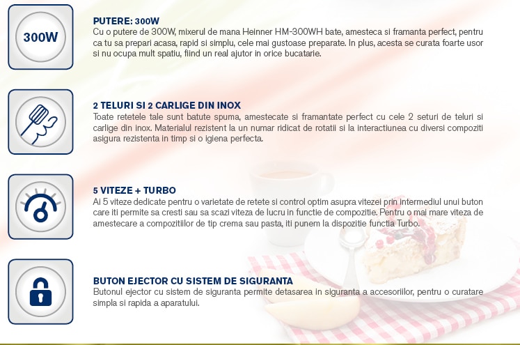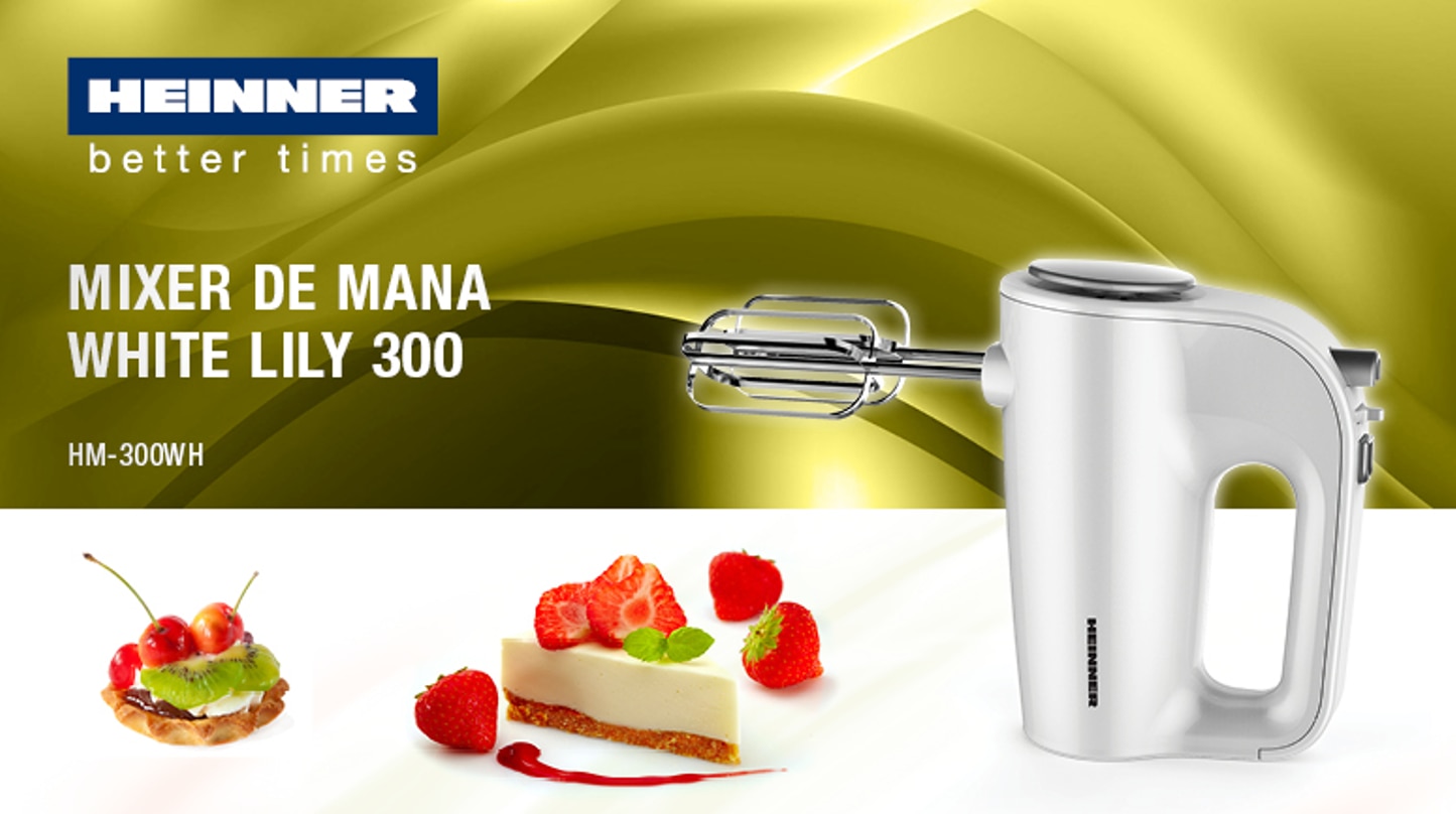 Mixer de mana Heinner HM-300WH, 300W, 5 viteze, functie Turbo, accesorii din inox, alb