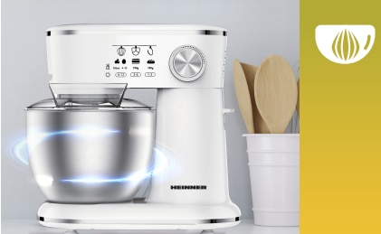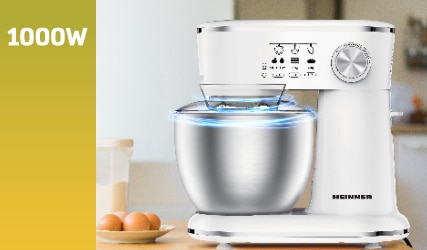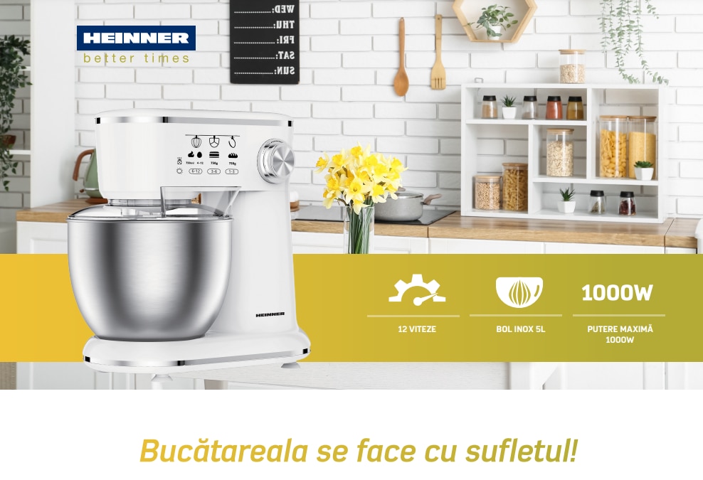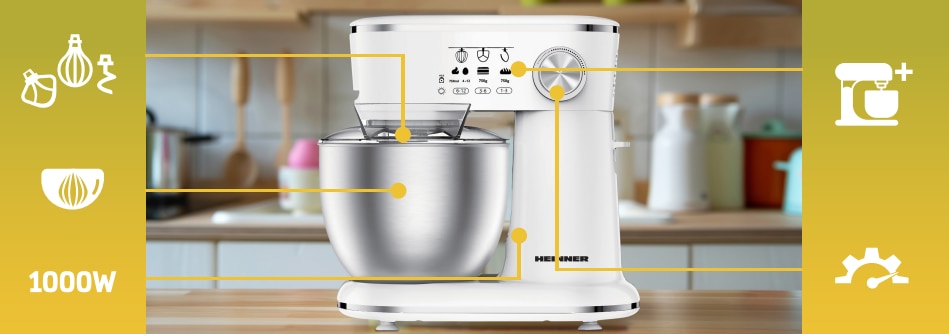 Mixer planetar Heinner HPM-1000WHCH , 1000w, bol inox 5l, 10 viteze, accesorii tel, carlig framantare, paleta, capac transparent protectie, Alb