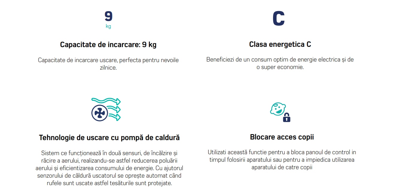 Uscator de rufe Heinner HHPD-M9K3A+++, Pompa de caldura, 9 kg, Inverter, 14 programe, Clasa A+++, Control touch, Functie Anti-Sifonare, Program Sterilizare, Iluminare cuva, Alb
