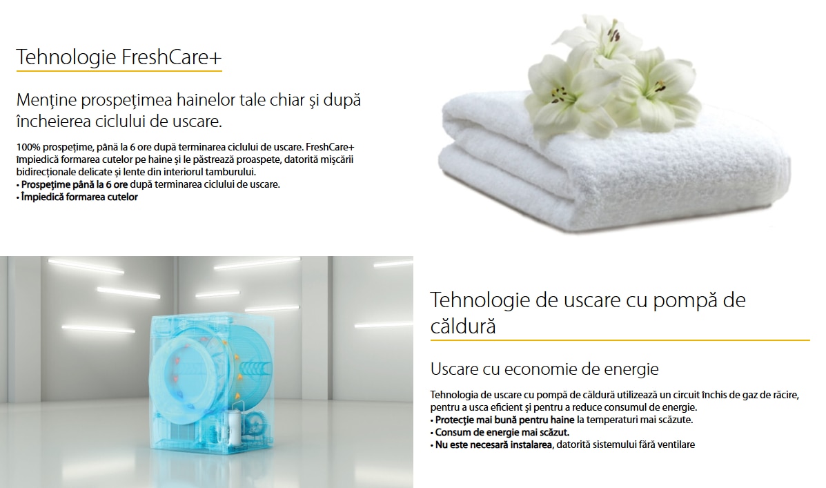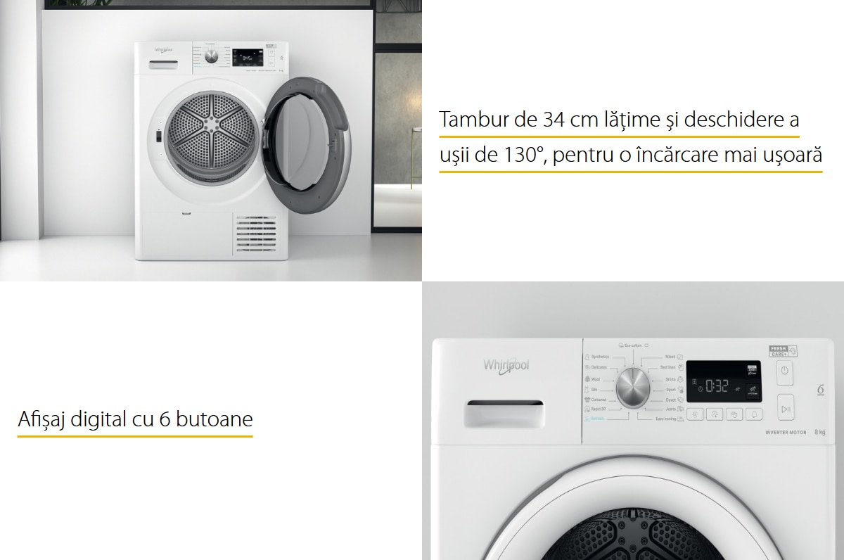 Uscator de rufe Whirlpool FFTM1182BEE, Pompa de caldura, 8 kg, Clasa E, Motor Inverter, Freshcare+, Tehnologia al 6-lea Simt, Alb