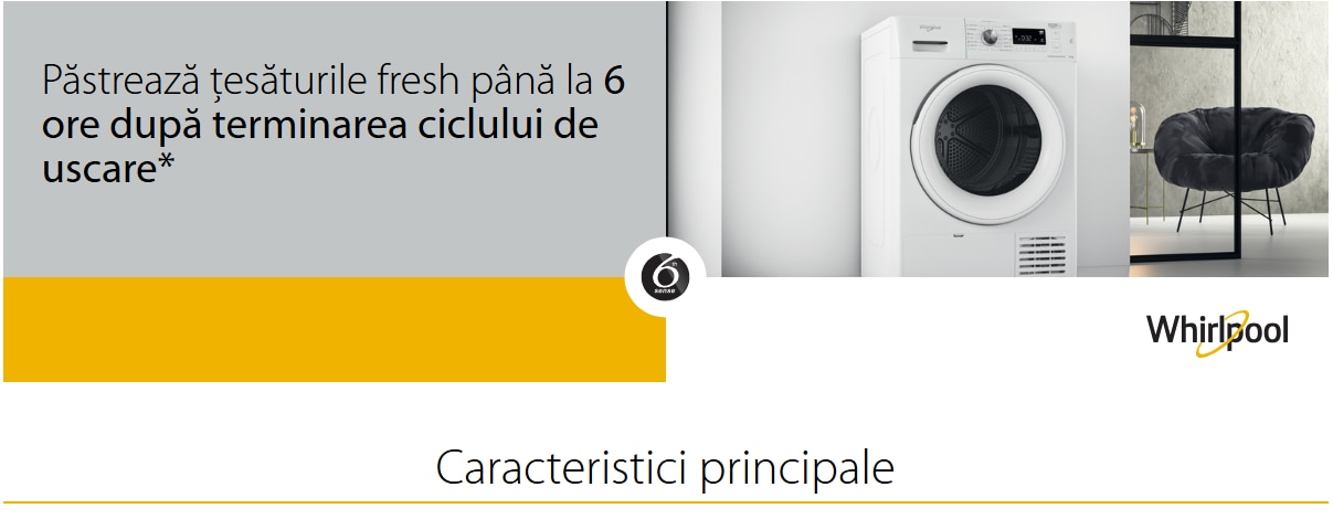 Uscator de rufe Whirlpool FFTM1182BEE, Pompa de caldura, 8 kg, Clasa E, Freshcare+, Tehnologia al 6-lea Simt, Alb